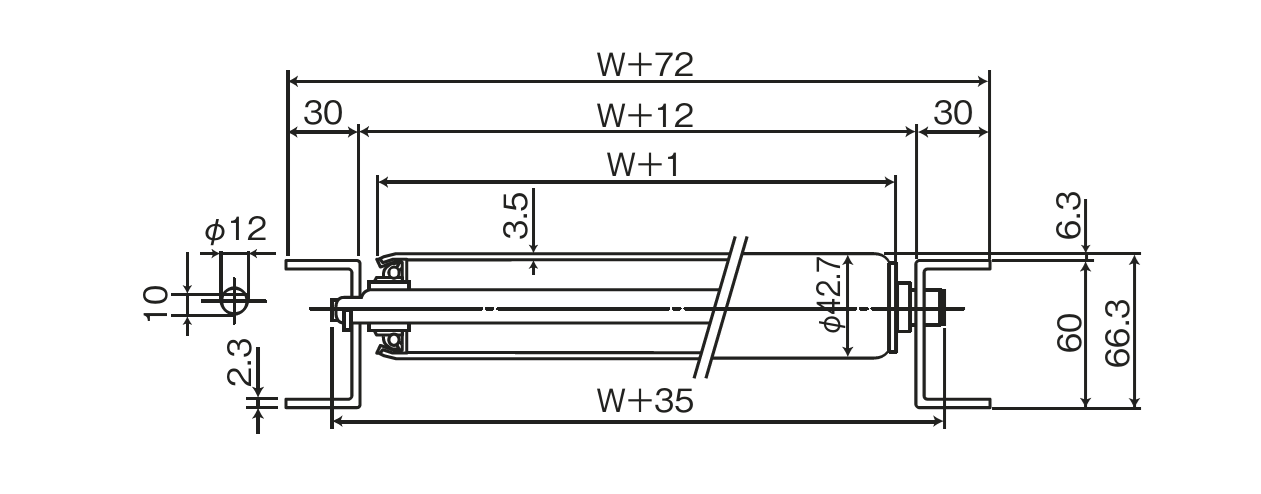 Φ42.7mmの低床ローラ。耐荷重100kgで重量物を機高を抑えて搬送できるタイプです。